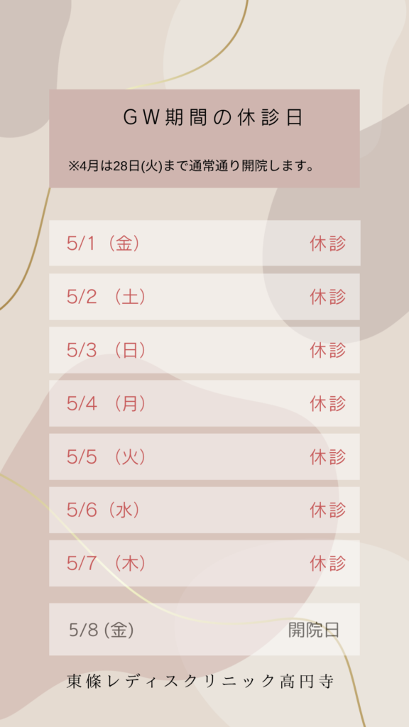 GW期間の休診のお知らせ お知らせ 2026/04/14 GWについて、5月1日(金)、2日(土)を休診とさせていただきます。 4月中は、4月28日(火)まで通常通り開院し、5月は5月8日(金)から開院となります。 よろしくお願いいたします。 前へ